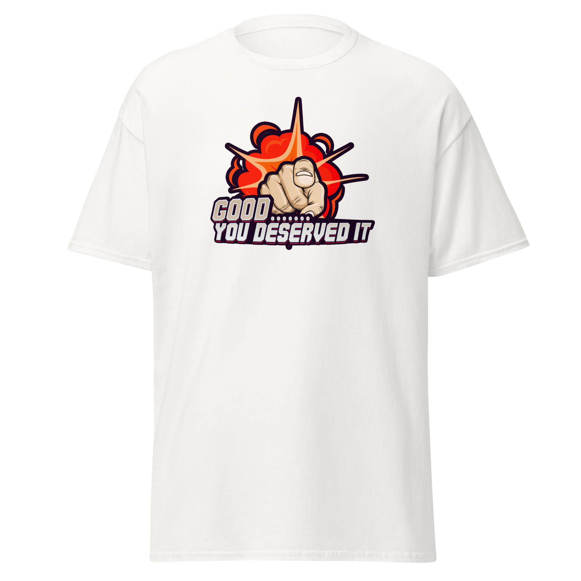 Better then your moms biscuits! This official AC Fitz T-Shirt features the unapologetic, high-energy side of "The peak personal trainer." The bold graphic—a pointing hand over an explosion—is the perfect way to deliver Fitz's signature, straight-talking trash: "GOOD.... YOU DESERVED IT!"